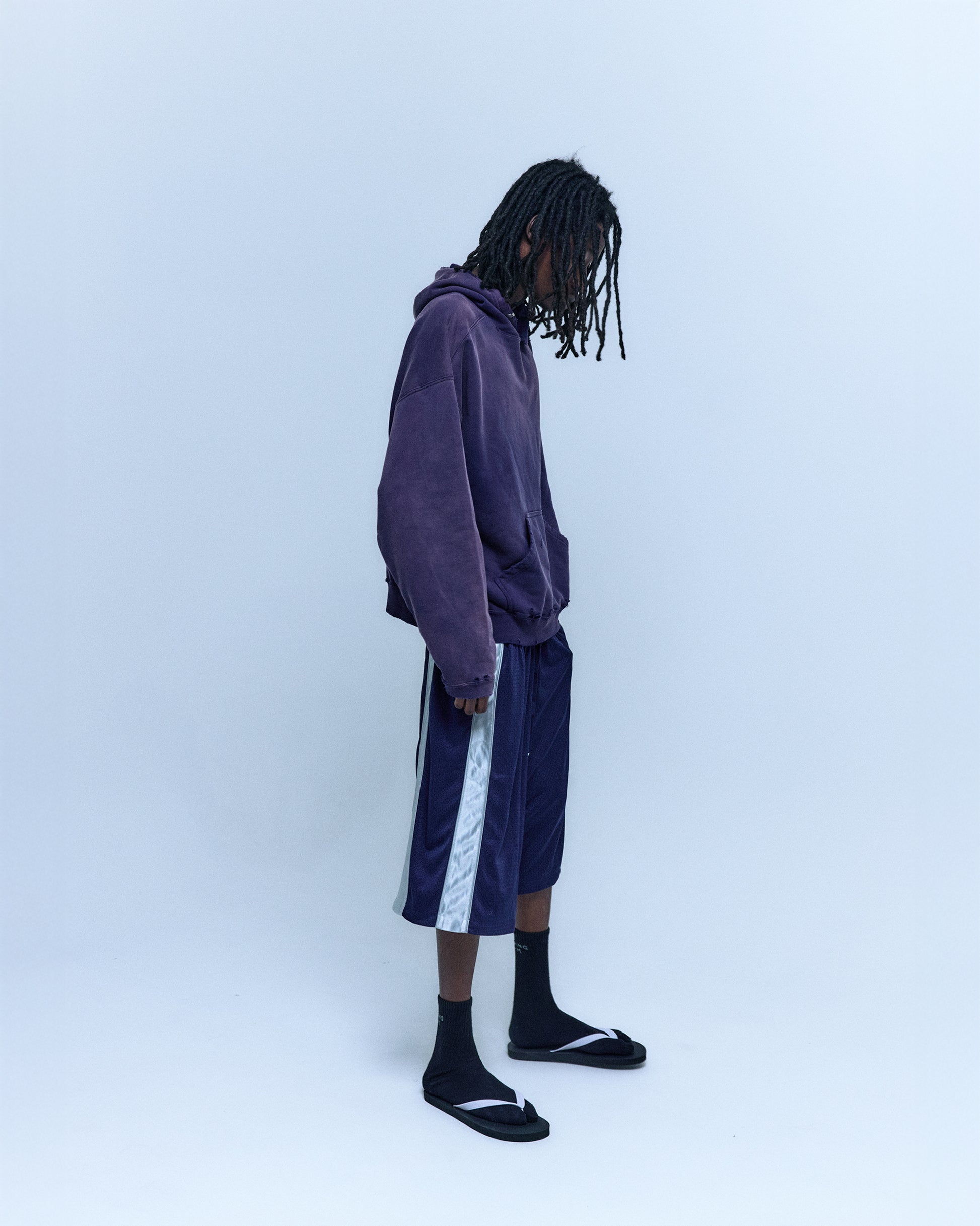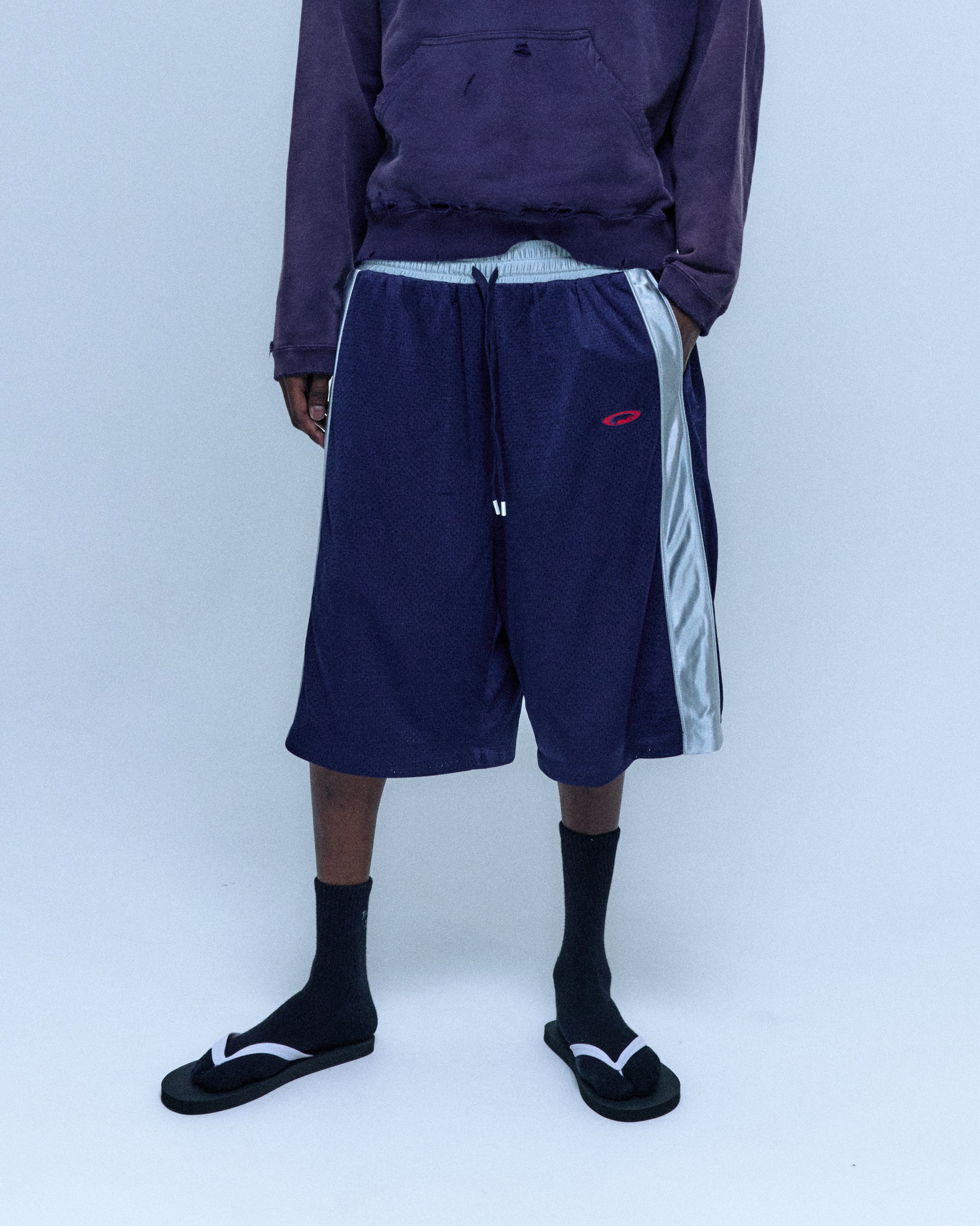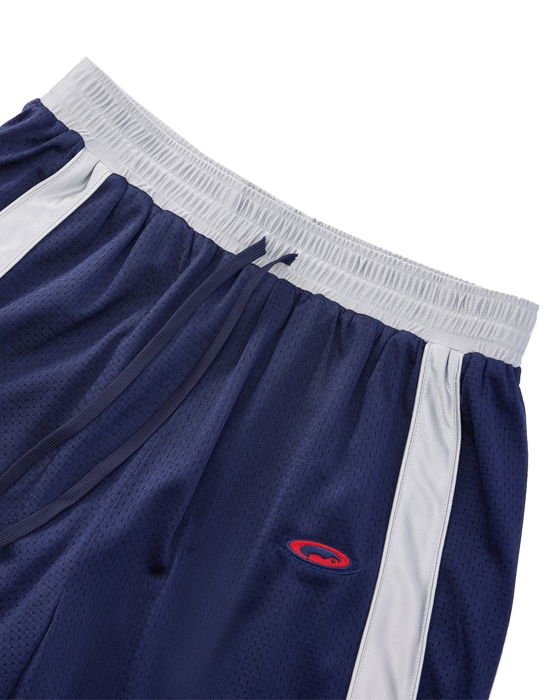 165GSM TWO LAYERS MESH, TAI CHI EMBROIDERY, WAIST BAND AND DRAWSTRING, FABRIC PRESHRUNK, OVERSIZE FIT.