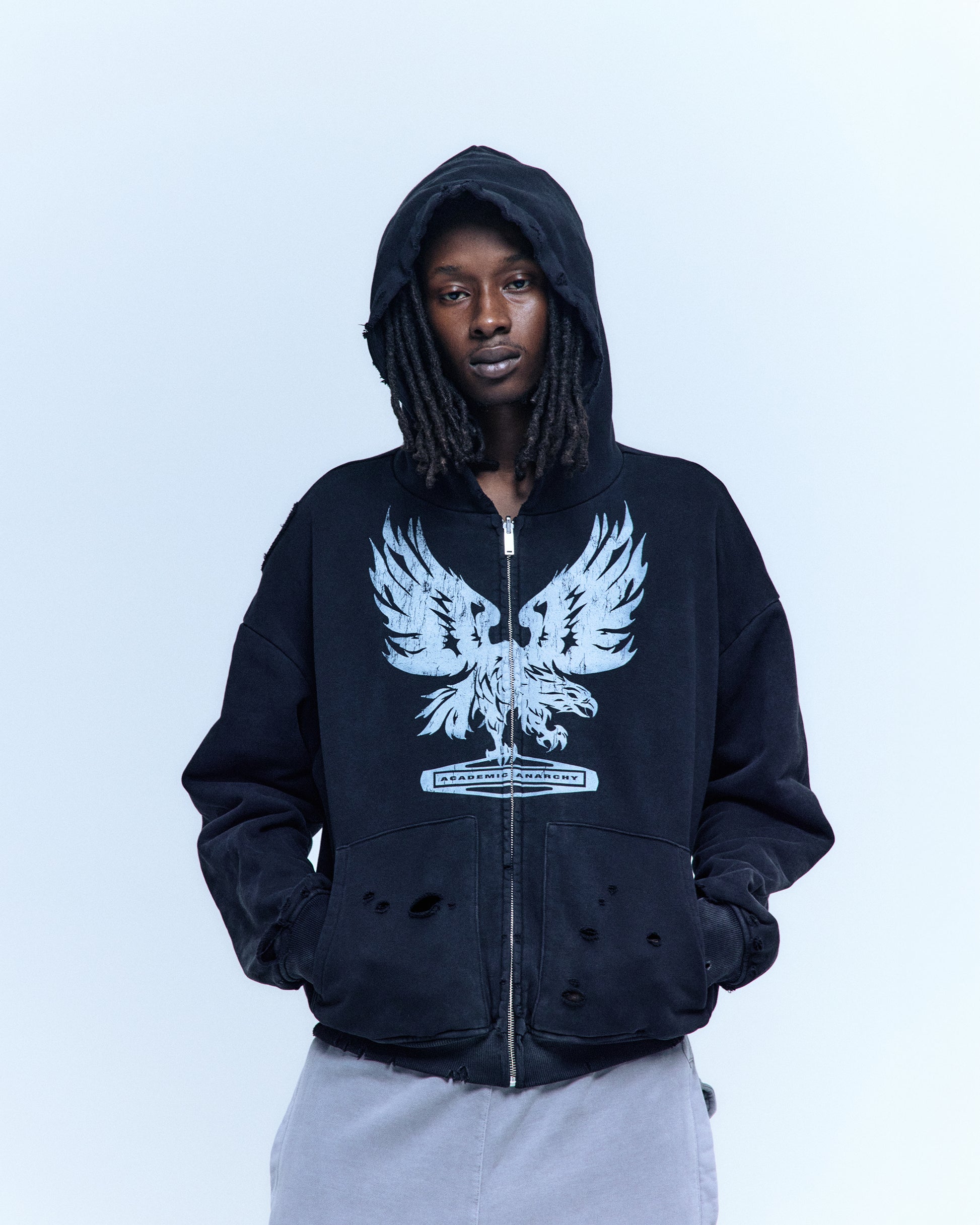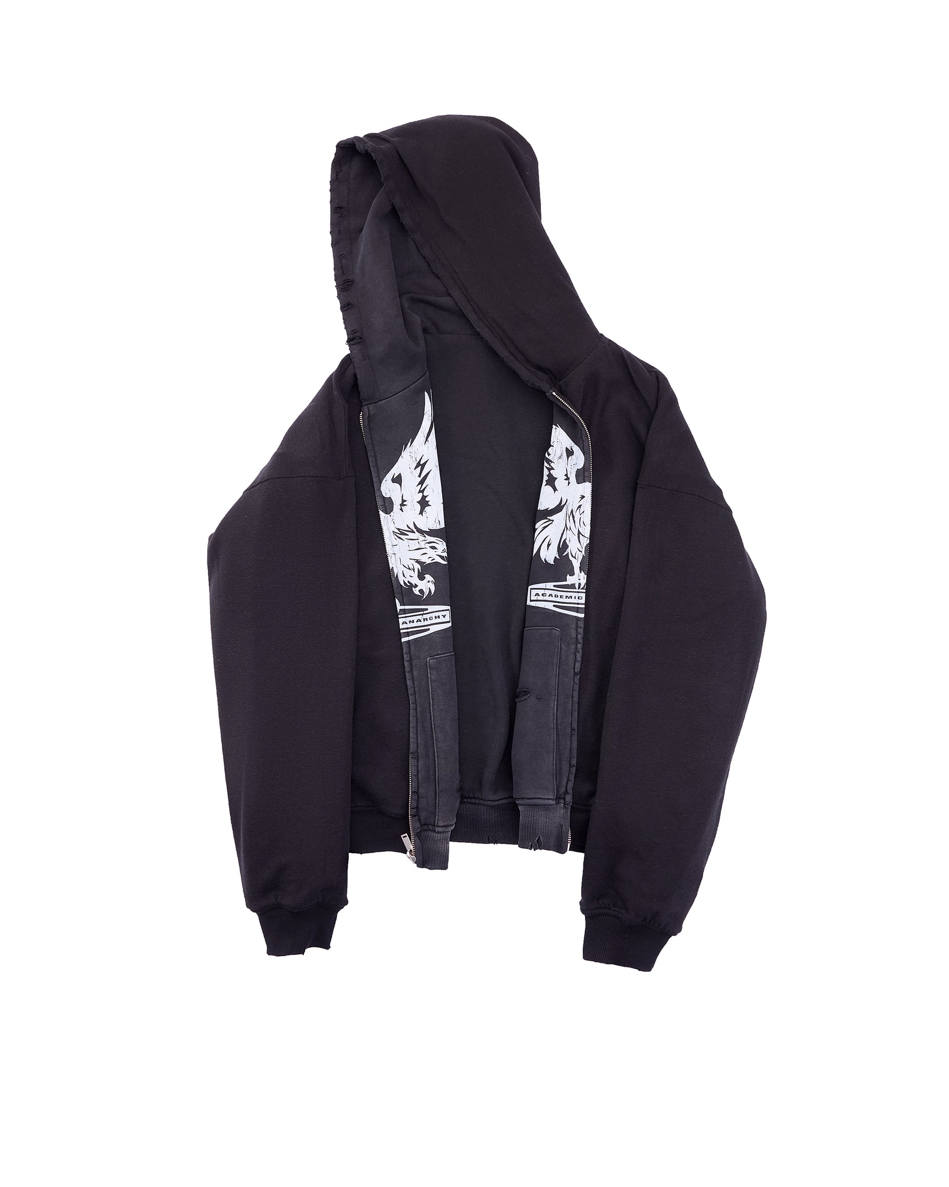 360GSM COTTON KNITTING, 170GSM FINE COTTON, DTG PRINT, SPECIAL FADE/WASH PROCESS, REVERSIBLE DESIGN, SIZE 5 YKK ROTATED ZIPPER, HAND DISTRESSING, CUFF AND HEM RIBBING.