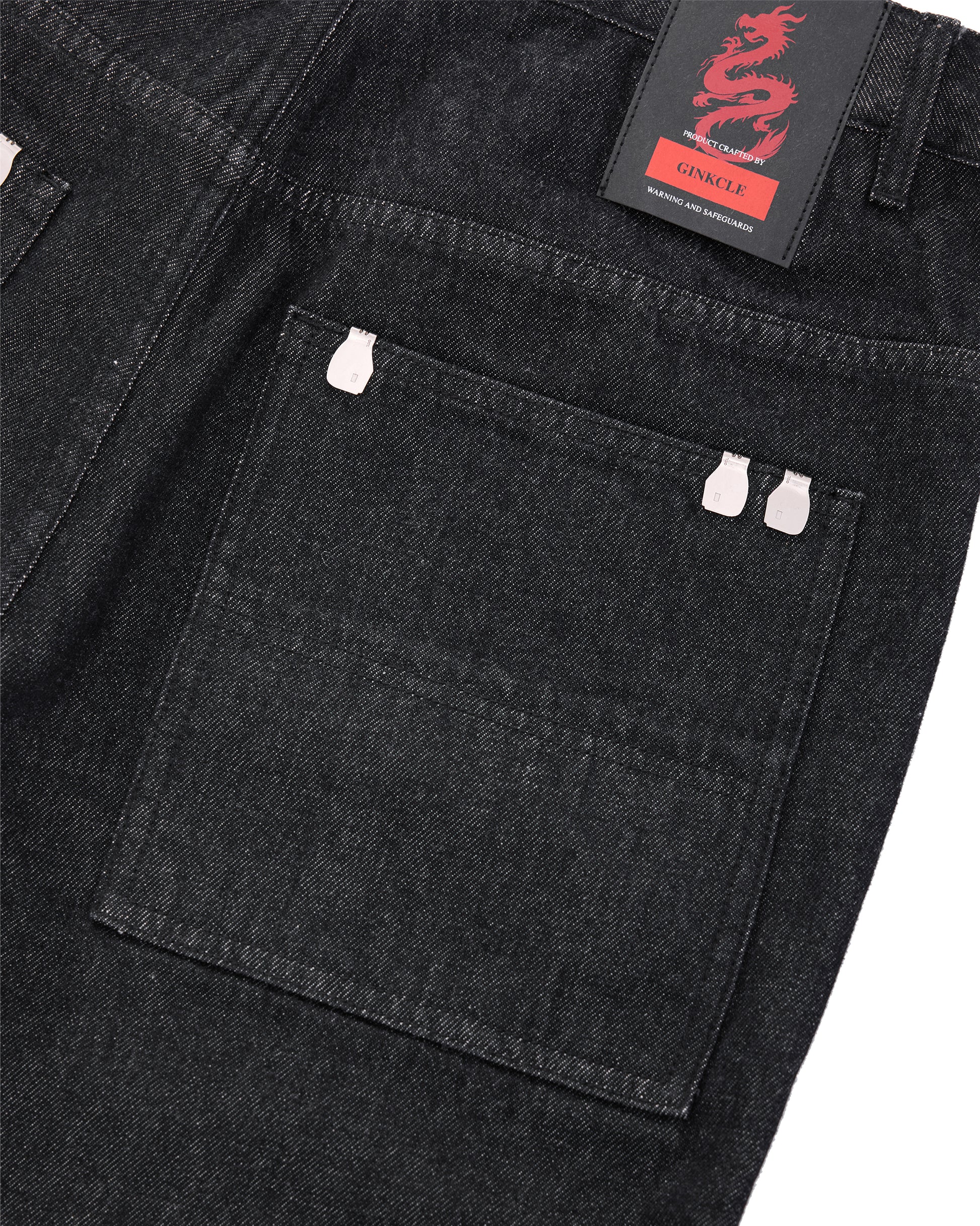 13OZ USA CONE RAW DENIM, DESIZED TREATMENT, 10 MOULD LIGHTER TAB CLIPS, YKK ZIPPER FLY AND STUDS, LOOSE FIT, 6 POCKETS, DRAGON KRAFT PATCH.
